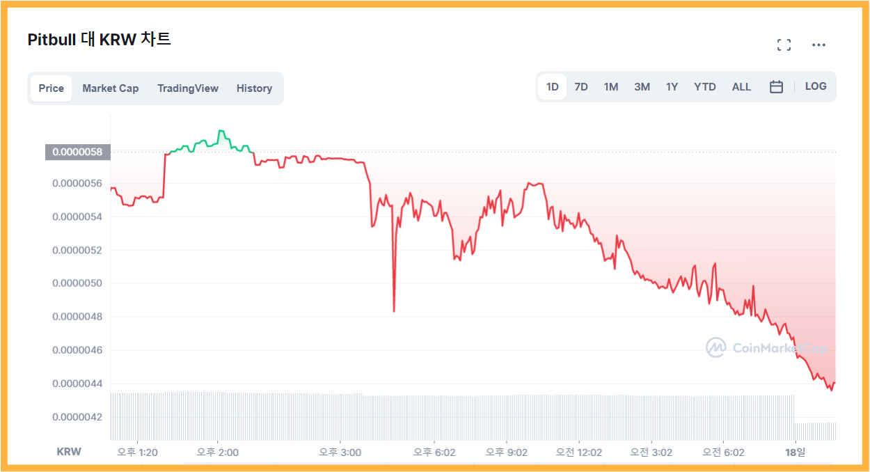 차트는 일 / 주 / 월 / 3개월 / 1년 단위로 제공이 됩니다. 아래 사진은 밈코인 중 핏불코인 차트입니다. 하락하고 있네요