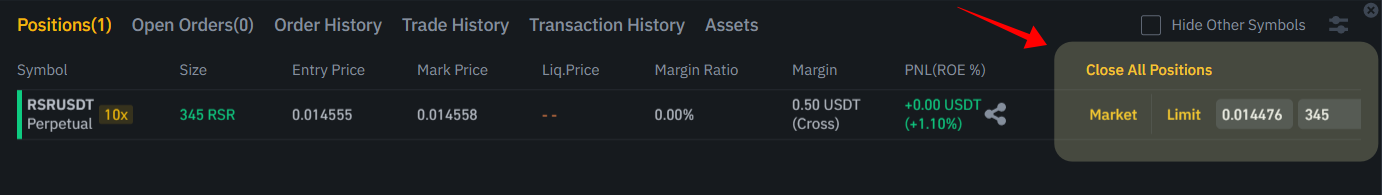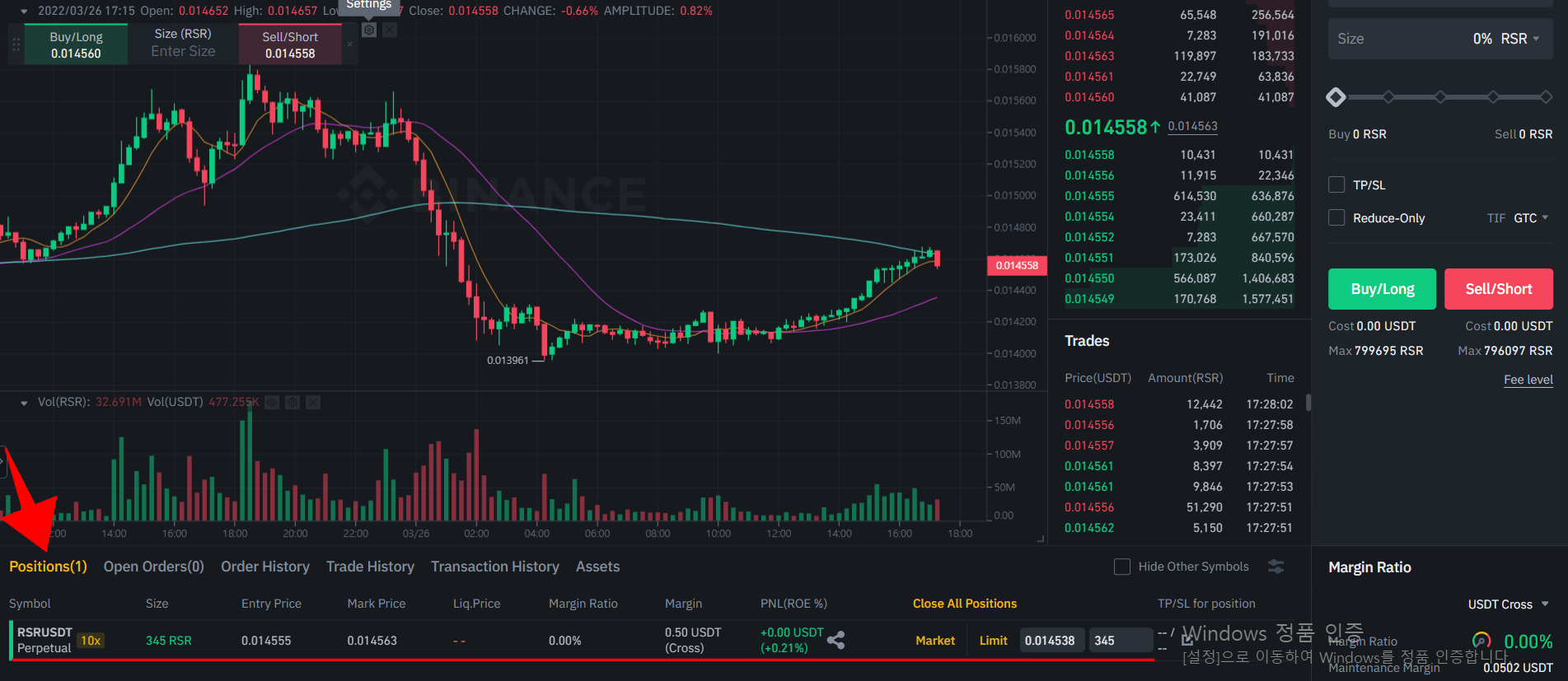 ▶ PC화면으로 설명드립니다. 우선 바이낸스 선물 거래창 하단에 보시면 내가 보유하고 있는 선물양과 정보가 표시됩니다.